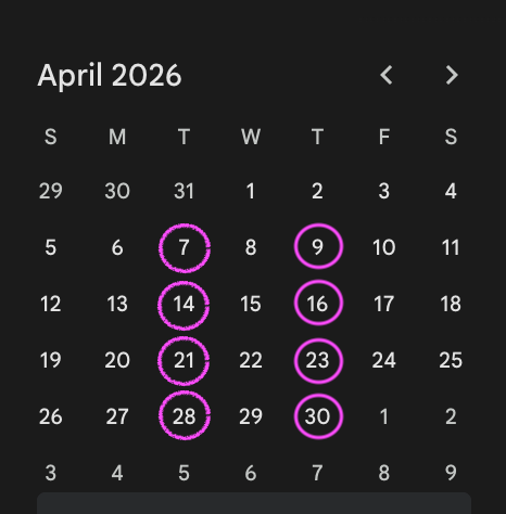 DAYS: Tuesdays and Thursdays in April, beginning on April 7th