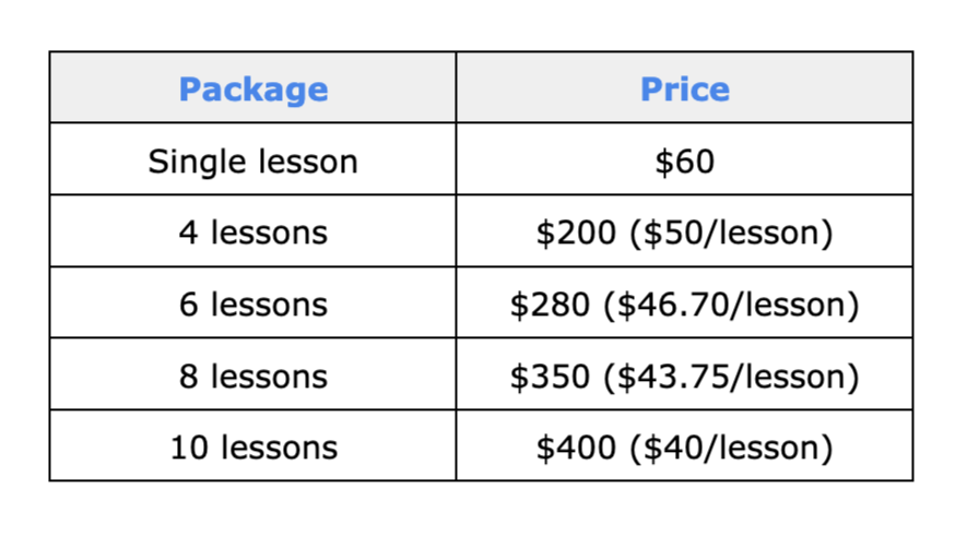 Lessons are offered either in person or via Zoom.